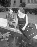 Off to Europe July 1, will be Betty Baird, left, who will enter Gulf Park College in the fall, while Joy Sweeney, right, will enter Christian College in Columbia, Missouri. Two girls are shown seated outside.