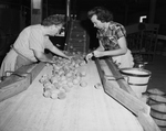 Peaches roll down a conveyor belt to be handled through a grading machine. Excessively ripe fruit is removed before peaches reach cleaning machinery. There are two unidentified women sorting through the peaches.