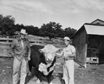 John and Jack Rowland, a father and son ranching team in Bosque County, are shown here with one of their Polled Hereford herd sires, GHR Mesa Mischief 656.