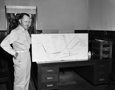 Difference in soil carried in runoff water from landed farmed with conservation methods and land farmed in the customary manner on the United States Experiment Watershed at Riesel is shown in this chart held by Project Supervisor R. W. Baird. Published in Fort Worth Star-Telegram morning edition October 1, 1950.