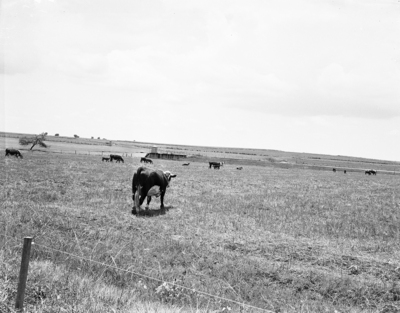 Cattle are being used as a part of the balanced farming program on the experimental watershed at Riesel. These cattle graze on pastures which slow runoff and soil loss. A concrete check point is shown in the background. Published in Fort Worth Star-Telegram morning edition October 1, 1950.