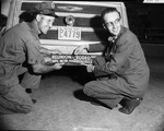 B. L. Womack, left, president of the Henrietta Chamber of Commerce, and Dr. Don R. Swick, chamber secretary, point out a reminder of the event to attract over 15,000 persons. In the photograph are two men standing in front of a license plate of a car kneeling down and smiling.