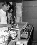 Richard Crow, left, Jimmie Wall, partners in a profitable poultry venture in Midland County, prepare eggs for packing in nested cartons in their egg room.