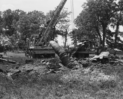 Navy wrecking crane from Grand Prairie Naval Air Station, pulls wreckage of jet plane from hole in earth where it burrowed when Chance Vought Test Pilot Warren P. Smith crashed to his death noon near Grand Prairie. Published in the Fort Worth Star-Telegram evening edition, July 07, 1950.