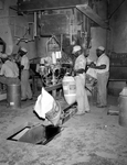 The feed sacks have been filled with an exact amount of feed and are fed into the sewing machinery which is started automatically, sewing the top of the sack and then dumping the finished sack into a chute.