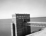 Intake structure of the 37,540-foot long San Angelo Dam, controlling two 18-foot diameter flood conduits and two 30-inch diameter water supply conduits. When water in now partially-filled North Concho Lake reaches flood control capacity of 277,200 acre-feet it will pour over an uncontrolled 1,150-foot long spillway, located 4,000 fee west of the south end of the dam.
