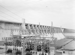 Whitney Dam, flood control and hydroelectric installation built by the Corps of Engineers, already has backed enough water into Whitney Reservoir to give Texans another important lake resort. The picture was taken downstream, showing floodgates, stilling basin, power plant and transformer station. State Highway 22 crosses the 19,600-foot long dam.