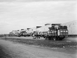 Hillsboro and Hill County celebrate its first 100,000-bale cotton crop since 1931. Farmers with baled cotton, line up at Exporters & Traders Compress, to get warehouse receipts needed for government parity loans. Shown beside the building are trucks carrying baled cotton, and a group of five men sitting on the ground.