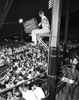Bill Lauritzen, TV cameraman, covers a baseball game for WBAP-TV. At his station, Bill Lauritzen is seating on a plank that raises the camera above the crowd. Published in the Fort Worth Star-Telegram morning edition, July 9, 1950.