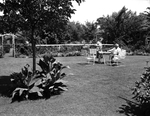Mr. and Mrs. W. H. Johnson, 925 Cleckler, are in their garden, which is in keeping with Fort Worth's beautification program sponsored by the Chamber of Commerce and the Star-Telegram. Mr. Johnson is sitting at the garden table and Mrs. Johnson stands across from him at the other side of the table. Published in the Fort Worth Star-Telegram evening edition, July 14, 1950.