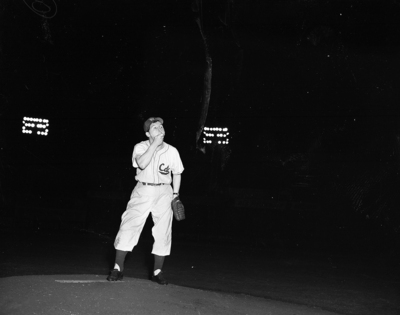 Image shows Eddie Bracken concentrating on pitchers mound. He is shown whistling in a pre game pitching demonstration by the comedian at La Grave. Published in the Fort Worth Star-Telegram evening edition, July 7, 1950.