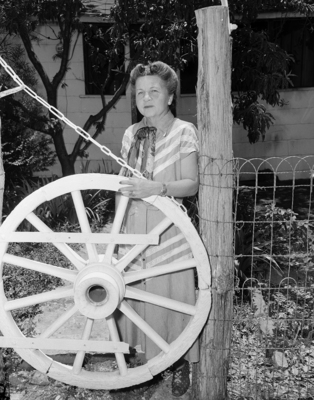 Image shows Dorothea Griffin standing behind front wagon wheel gate of her ranch home. She gave up her music career to run a ranch. Published in the Fort Worth Star-Telegram morning edition, July 2, 1950.