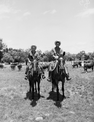 Image shows E. F. Hudson, left and Arthur Sansom, right on horse. They are ranch foremen for the Griffin Ranch. Published in the Fort Worth Star-Telegram morning edition, July 2, 1950.