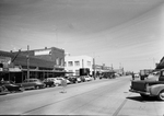 Cross Plains' main street is lined with oil field supply houses, grocery stores, service stations, cafes, and mercantile firms. The Citizens Bank is housed in white two-story building at center. Published in Fort Worth Star-Telegram morning edition March, 1954.