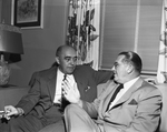 Congressman Carl Hinshaw, California Republican, left, and George Halderman, right, CAA chief of flight, noted test pilot and pioneer trans-Atlantic flier, argued good-naturedly the merits of jet planes for commercial transport, on the arrival in Fort Worth. They will attend groundbreaking ceremonies for the Amon G. Carter Terminal Building at Greater Fort Worth International Airport. Published in the Fort Worth Star-Telegram morning edition, July 09, 1950.