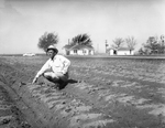 Farmer Walter Kelly of Courtney tests earth in an 11-acre field he is irrigating in preparation for cotton planting. Sprinklers are operating in the background. Published in Fort Worth Star-Telegram morning edition April, 1954.