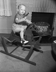 Mike Cunningham, 3, sits astride his rocking horse, Trigger, and fires his six-shooter at whoever is in the way. Mike is the son of Mr. and Mrs. Kenneth H. Cunningham. National Baby Week is celebrated throughout the week. Published in Fort Worth Star-Telegram morning edition April, 1954.