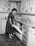 Mrs. Frank B. Gooch shows how the electric dish washer unfolds in the kitchen cabinet of her new home at 3408 Creston. Published in Fort Worth Star-Telegram morning edition April, 1954.