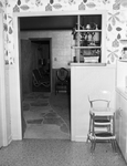 The picture shows the kitchen through the dining area into the den of the home of the Dewitt McKinleys, 6728 Fortune Rd. The flagstone walk is leading through the carpeted dining area. It saves wear and tear on carpets while providing a novel effect. Published in Fort Worth Star-Telegram morning edition April, 1954.