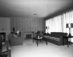 The picture shows the carpeted living room of the Scranton Jones home, 3929 South Dr. The fireplace wall at the end of the room is made of Roman brick. The draped window wall at right overlooks a walled patio at the rear of the house. Published in Fort Worth Star-Telegram morning edition April, 1954.