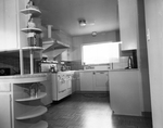 The kitchen as seen in the new home of the Scranton Jones family, 3929 South Dr., is symbolic of efficiency. The color scheme is white with turquoise tile drain board. At one end of the kitchen is the breakfast area, overlooking the front entrance of the house. Published in Fort Worth Star-Telegram morning edition April, 1954.