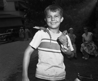 Clell Harral, son of Mr. and Mrs. Albert Harral of 5137 El Campo, won the most unusual pets contest with his baby alligator, Willie, and his bantam rooster, Midget. Clell donated Willie to the museum. Published in the Fort Worth Star-Telegram morning edition, July 09, 1950.