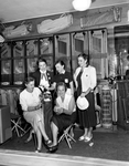 In the golf shop, the total score was of interest to all. Seated left is Mrs. J. A. McCombs, and seated right, Mrs. Ruby Copeland Jr. Standing, left to right are Mmes. J. O. Chambers, Laidlaw Palmer and Joe R. Wise.