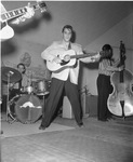 Elvis Presley, 21, with guitar at microphone at Fort Worth's North Side Coliseum in April 1956 - playing with The Blue Moon Boys.
