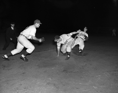 Image shows a baseball game between Fort Worth and Oklahoma City. Shows Outfield Stu Locklin, Oklahoma City , head for Fort Worth's Dee Fondy, center, for an out. To the far right is Russ Rose, who appears to be falling. The umpire, left, is Fred Sigler. Published in the Fort Worth Star-Telegram morning edition, July 9, 1950.