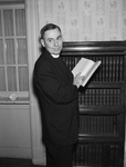 Image shows Very Reverend Philip O' Regan, The Order of Saint Benedict holding book in front of bookshelf. He is St. Mary's new pastor.
