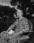 Image shows a shot of Mrs. William R. Smith, who will soon be 92 has lived in her Parker County home for 65 years. She is shown seated in a chair outside her residence. Mrs. Smith remembers her Civil War experiences.