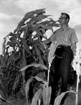 Sorghum, experiments. Farm and Ranch. Dr. Nicholas W. Kramer inspects a sorghum plant produced by crossing an American sorghum with an African type. The tropical African types do not produce seed under Texas growing conditions.