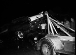 A flood-battered car, caught in the tangle under the West Rosedale underpass just west of 8th Avenue is pulled from atop a sport car which was abandoned by a TCU student when water gushed into the low place Wednesday evening.