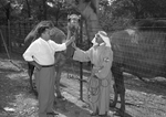 Forest Park Zoo Director Hamilton "Ham" Hittson and Shriner Al Wooten hold Mr. Moslah's new mate. Mrs. Moslah will move across the fence with Mr. Moslah when "she tames down a little." Hittson arrived here with Mrs. Moslah from Los Angeles. Published in Fort Worth Star-Telegram morning edition July 10, 1950.