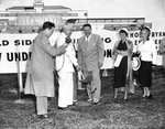 Amon Carter digs a hole at the ground-breaking for the Amon Carter Administration Building and Airfield, while people stand around him. Among the people around him are: Bill Guy, Mrs. J. Lee Johnson, and Mrs. Amon Carter.