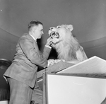 Joe Horner, Arlington wildlife artist whose paintings are on display at Children's Museum, poses with one of his subjects, lion trophy from the African exhibit of Mr. and Mrs. Harry Tennison.