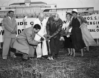 Amon Carter gets help breaking ground at the Amon Carter Administration Building and Airfield ground-breaking, while people stand around him. Among the people around him are: Bill Guy, Mrs. J. Lee Johnson, and Mrs. Amon Carter.