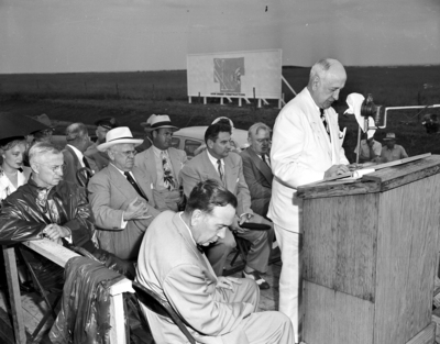 Amon Carter speaks to crowd at the dedication of the Greater Fort Worth International Airport. Others on the speaker's stand are: John W. Carpenter, Amon Carter, Brigadier General C. S. Irvine, Marvin Leonard, Mayor Deen, Amon Carter Junior, Mrs. J. Lee Johnson III, Raymond Buck, and D. E. Rentzel.