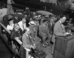 Man speaks to crowd at the dedication of the Greater Fort Worth International Airport. Others on the speaker's stand are: John W. Carpenter, Amon Carter, Brigadier General C. S. Irvine, Marvin Leonard, Mayor Deen, Amon Carter Junior, Mrs. J. Lee Johnson III, Raymond Buck, and D. E. Rentzel.