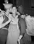 Carl Jr., left and Ronald Graner greet their mother, Mrs. Carl Graner with a kiss at T&P Station. They both attended the Boy Scout Jamboree at Valley Forge, PA with 105 other Fort Worth Scouts. They are Eagle Scouts of Explorers Post 2017.