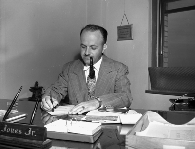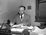 Image shows Colonel Jones seated at desk. Lt. Colonel William P. Jones is the new executive officer of Fort Worth district, Corps of Engineers. He served as engineer from November 1945 until April 1946 in Korea. The new executive officer served on two fronts. He was part of General Patton's task force and served throughout the African, Sicilian and Italian campaigns. After V-E day he was sent as commander of an engineer combat group to the Philippines. Later he crossed the China Sea from Manila to Pusan, Korea with a convoy of Land Ship Mediums. He was area engineer in Pusan. Jones was assigned here from Fort Sam Houston, where he was in charge of the San Antonio suboffice of the Galveston district, Corps of Engineers.