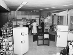 Image shows Salesman Burtis Holt , right, explaining features of a TV set to two unidentified customers at the opening of the appliance and TV center of Sabine River Valley Lumber Company.