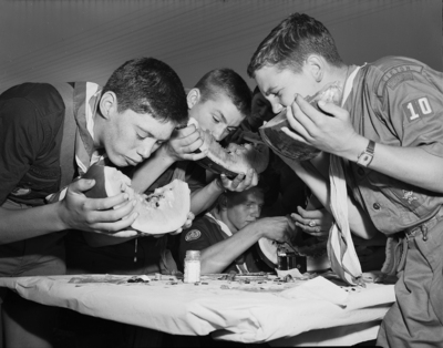 Donald Dean, Frank Young and Lionel Howerton were three of 436 Boy Scouts from Washington and Idaho who ate watermelon in the Fort Worth and Denver City Railway's 17th St. yards evening. They are en route home from the Valley Forge Boy Scout Jamboree. Published in Fort Worth Star-Telegram, morning edition July 11, 1950.