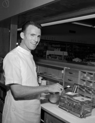 Image shows assistant manager, John R. Bolger, at Skillern's new departmental drug store at 2603 W. Berry. He measures a minute amount of powder on scales.