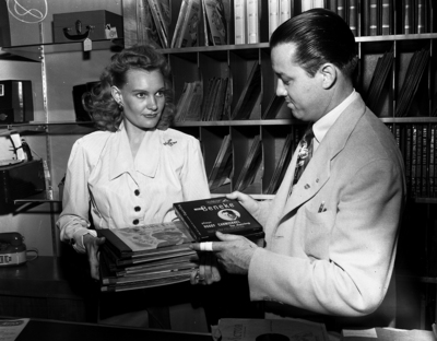 Image shows Miss Vinnie Mize, 3643 May, checks on a shipment with store manager Wayne Hill. Everything from classical records to modern music is available in Skillern's new store at 2603 W. Berry.