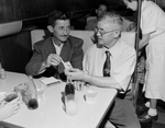 Image shows two brothers, Elias Kolias, left and Peter Kolias, right, visiting at a diner. Elias Kolias enjoys smoking American cigarettes and drinking soft drinks. Elias Kolias, a Greek revenue collector is visiting his brother, whom he hadn't seen in 24 years.