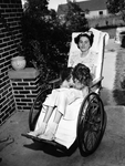 Dorothy Rhea Harris, 15, stricken with polio, is in a wheelchair holding a dog, returning home. Published in the Fort Worth Star-Telegram evening edition, July 12, 1950.
