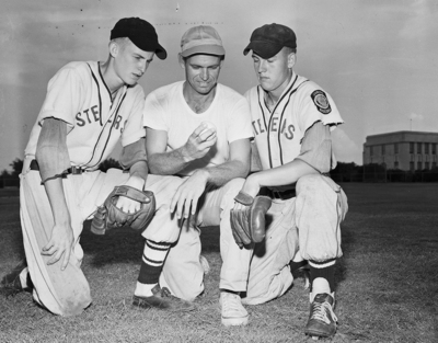Lewis Doan, center, coach of the city campion American Legion baseball team which next week meets a Dallas nine in district title playoff, talks it over with Pitchers Robert Votaw, left, and Bobby McDaniel. Published in Fort Worth Star-Telegram evening edition July 15, 1950.