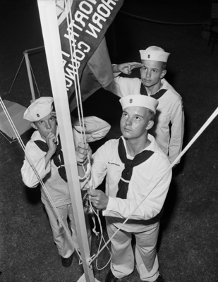 Color guard of the Sea Scout ship Yellowjacket hoist the commissioning pennant at ceremonies. Left to right, Gerry Griffin, 3917 Mattison, coxswain; David Mean, 6229 Calmont; and Otis Rogers Jr., 3620 Watonga, officer of the day. Published in Fort Worth Star-Telegram, morning edition July 14, 1950.