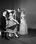 Larry Roquemore and Margaret Harrison, front, carry a big portion of the first act of "The Thunderbird," under the direction of recreation department and members of the fine arts department at TCU. The operetta which was presented for the last time at the North Side High School amphitheater. Dan Merriman and Hazel Bailey, back, left to right, are the youngsters grown up in the last act. The youngsters are dancing at the front while Dan Merriman and Hazel Bailey stand in the back watching them. Published in the Fort Worth Star-Telegram evening edition, July 28, 1950.